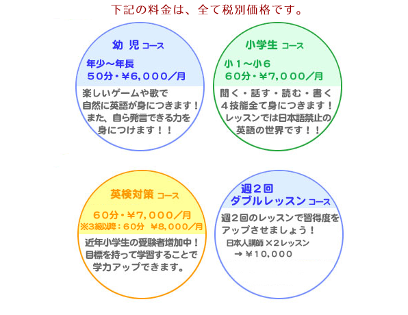 入会金が10,000円(税別)、 教材費が2,000〜4,500円(税別・約1年間使用)、お月謝はコースによって異なりますが5,000円(税別)〜です。割引などもございますので、詳しくはお電話にてお伝え致します。 |